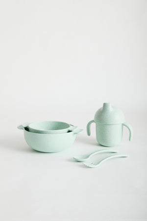 -Set contains: 1 x sippy cup, 1 x large bowl, 1 x small bowl, 1 x spoon & fork