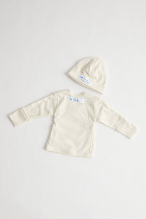 The perfect leaving hospital outfit. Super soft, long-sleeved organic cotton kimono style cardigan with matching beanie from Fog Linen Work. Perfect for a newborn baby. Packaged in a muslin pouch and makes an ideal gift.