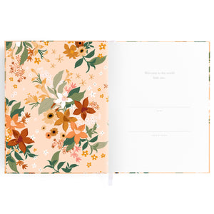 160 pages. Gold foil stamped floral printed linen cover. White grosgrain ribbon. 2mm foil stamped hard cover, lay-flat binding. Floral printed pages and premium 115gsm FCS-certified acid-free paper. Packaged in a cello sleeve with gold foil bellyband. Designed in Australia, printed in China. 280 x 220mm / 11 x 8.6"